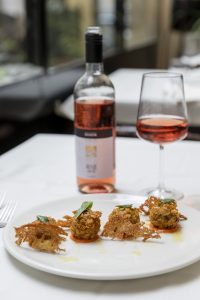 Baccalà mantecato con poca panna e basilico, su crostini di pane casareccio, granella di nocciola, riduzione di aceto balsamico,